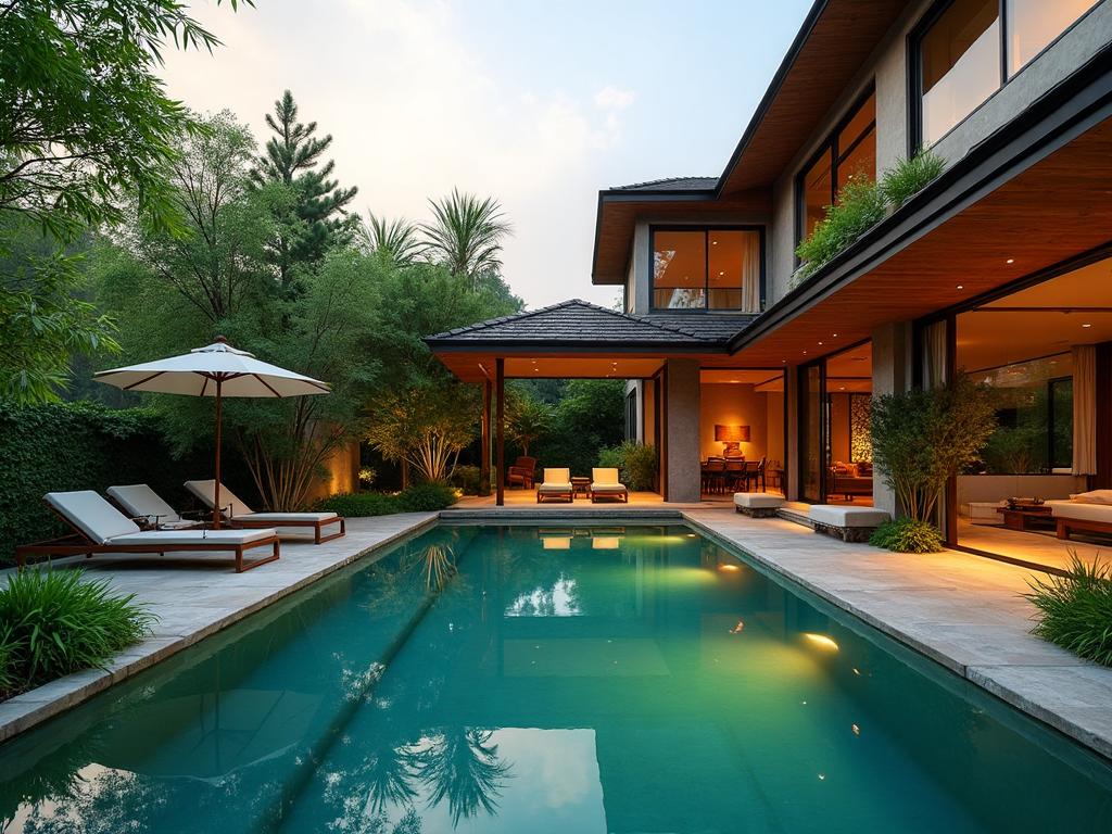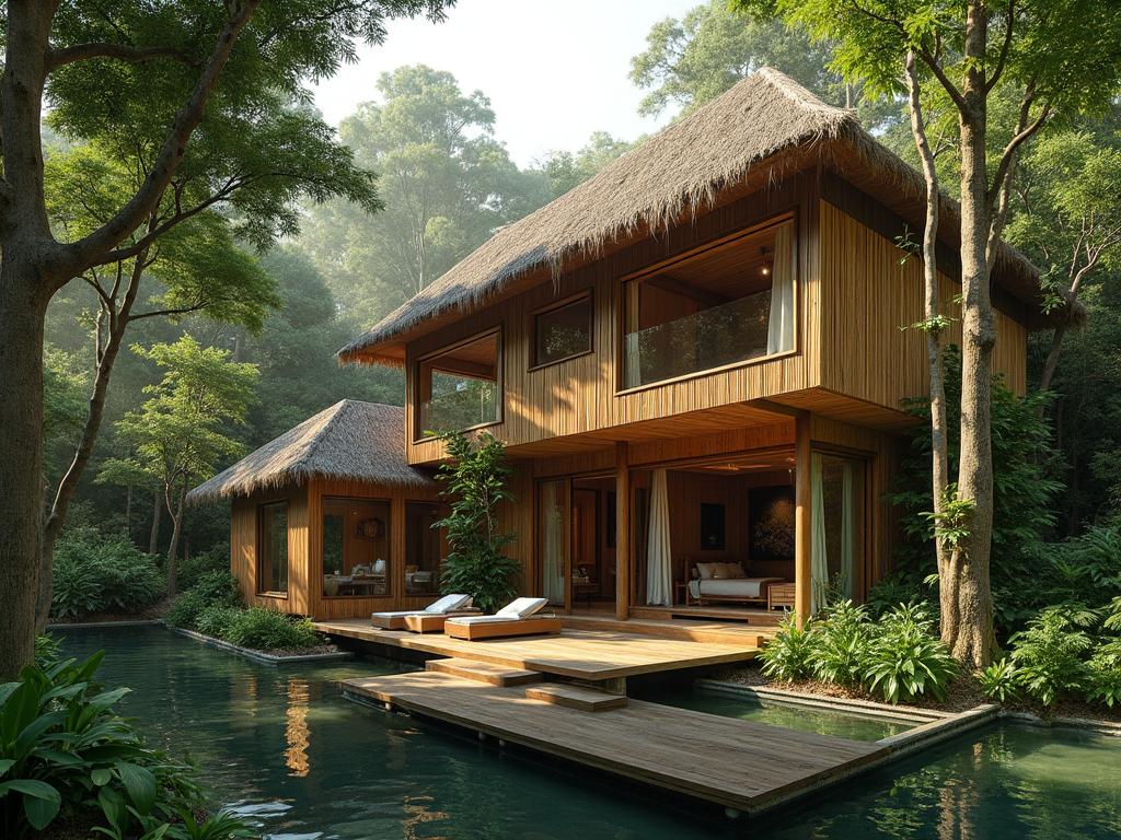 Sustainably inspired design with natural bamboo structure, thatched roofing, and zen garden. Optional pool integration for nature-immersed tranquility.