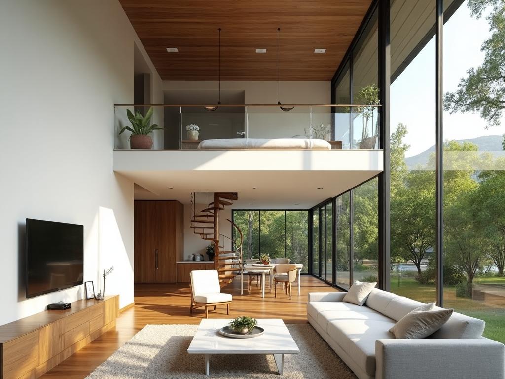 Double-height glass walls with elegant mezzanine bedroom. Contemporary minimalist design featuring spiral staircase and natural light flooding.